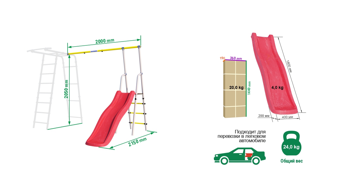 уп. 1: 1440 х 360 х 190 мм; 20 кг., уп. 2: 1800 х 400 х 200 мм; 4 кг