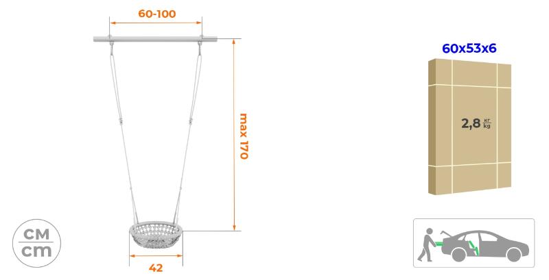 Данная модель качелей устанавливается на спортивные комплексы ROMANA с помощью специального каркаса для качелей. Она может быть установлена как на одинарную, так и на двойную балку для качелей. Качели надежно фиксируются на каркасе с помощью стальных крюков и карабинов, которые входят в комплект. Конструкция подвеса позволяет регулировать высоту качелей для идеальной подгонки под ребенка.