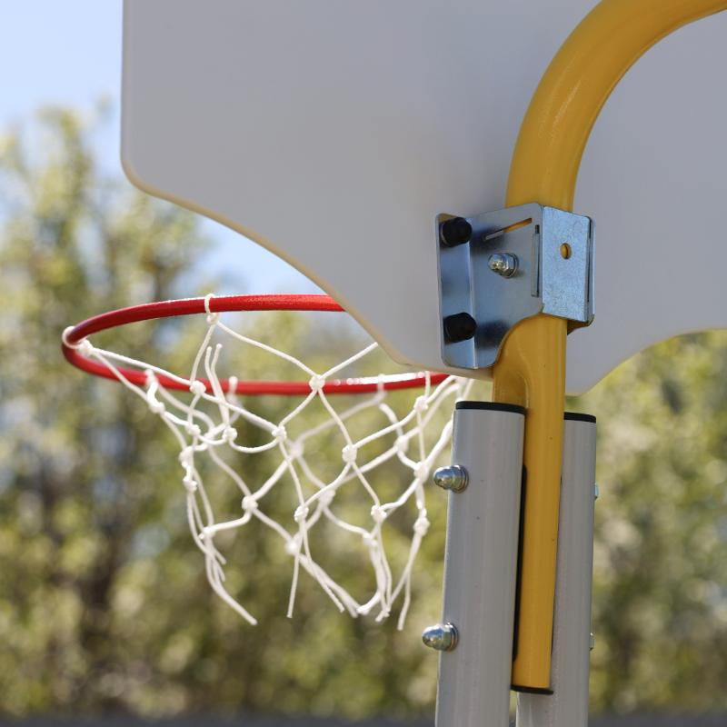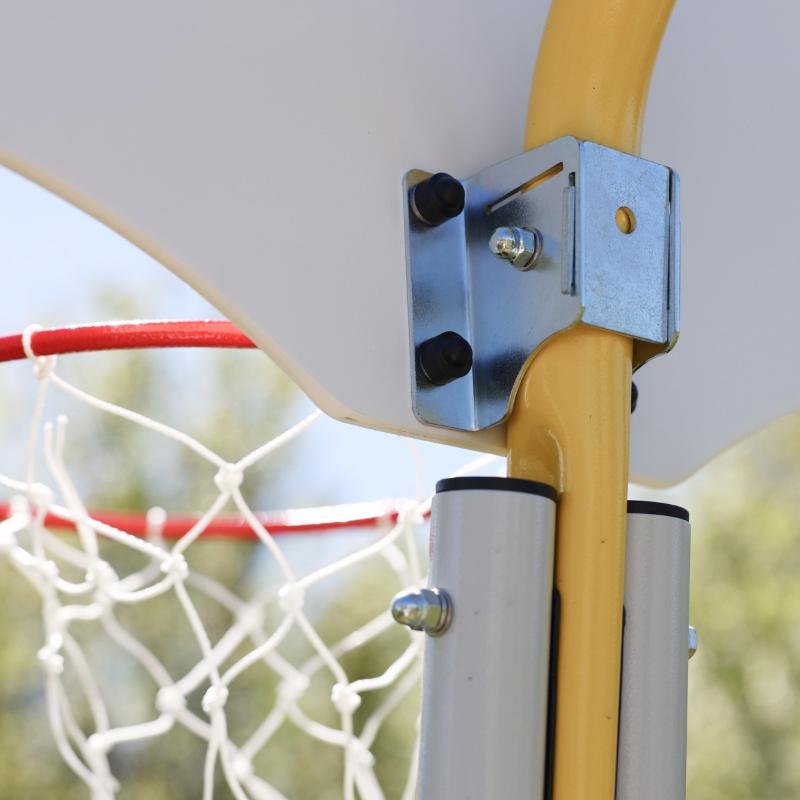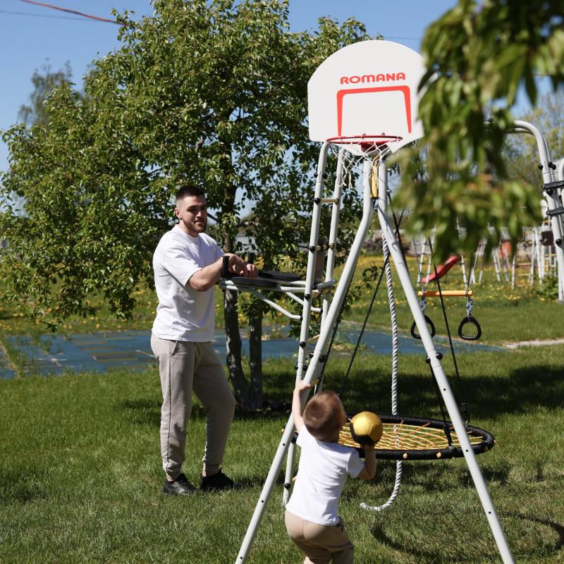 Баскетбольный щит можно установить на дачные комплексы, имеющие отвод. Щит устанавливается не зависимо от общей сборки. Для этого в дачных комплексах, выпущенных с 2024 года, в отводах имеется отверстие. Баскетбольный щит так же можно установить на дачные комплексы с горизонтальной балкой (без отвода).