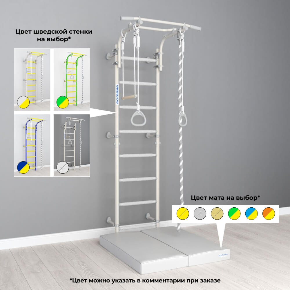 Домашний комплекс ROMANA Next Pastel Pro – это расширенный комплект с гимнастическим матом - мягким щитом. Гимнастический мат служит для предотвращения травм, ссадин и синяков при занятиях на домашнем спортивном комплексе. Используя гимнастический мат, ребенок будет чувствовать себя в безопасности и защищенным. Мягкий щит можно использовать для занятий гимнастикой, а также разнообразными физкультурными упражнениями.