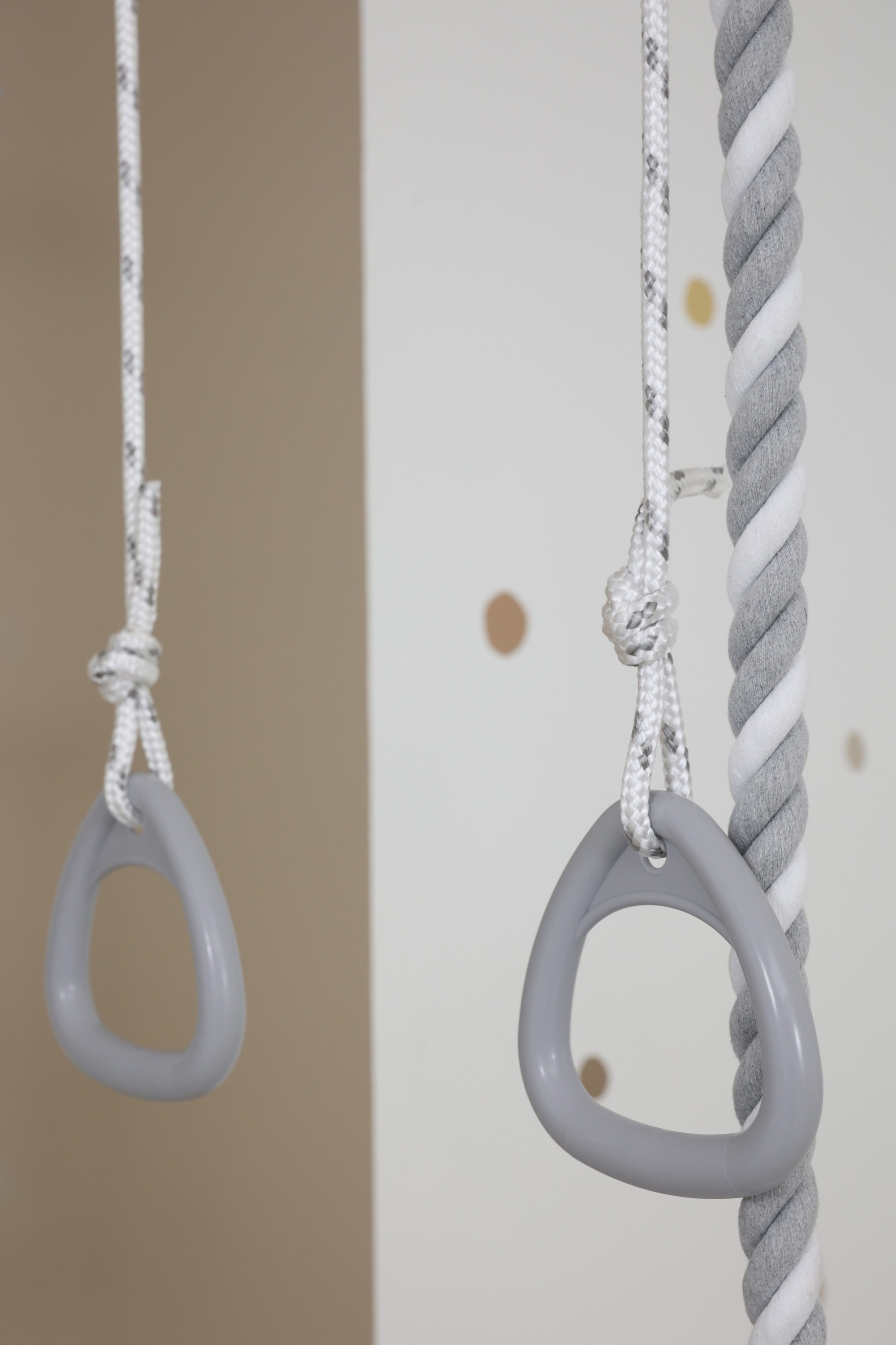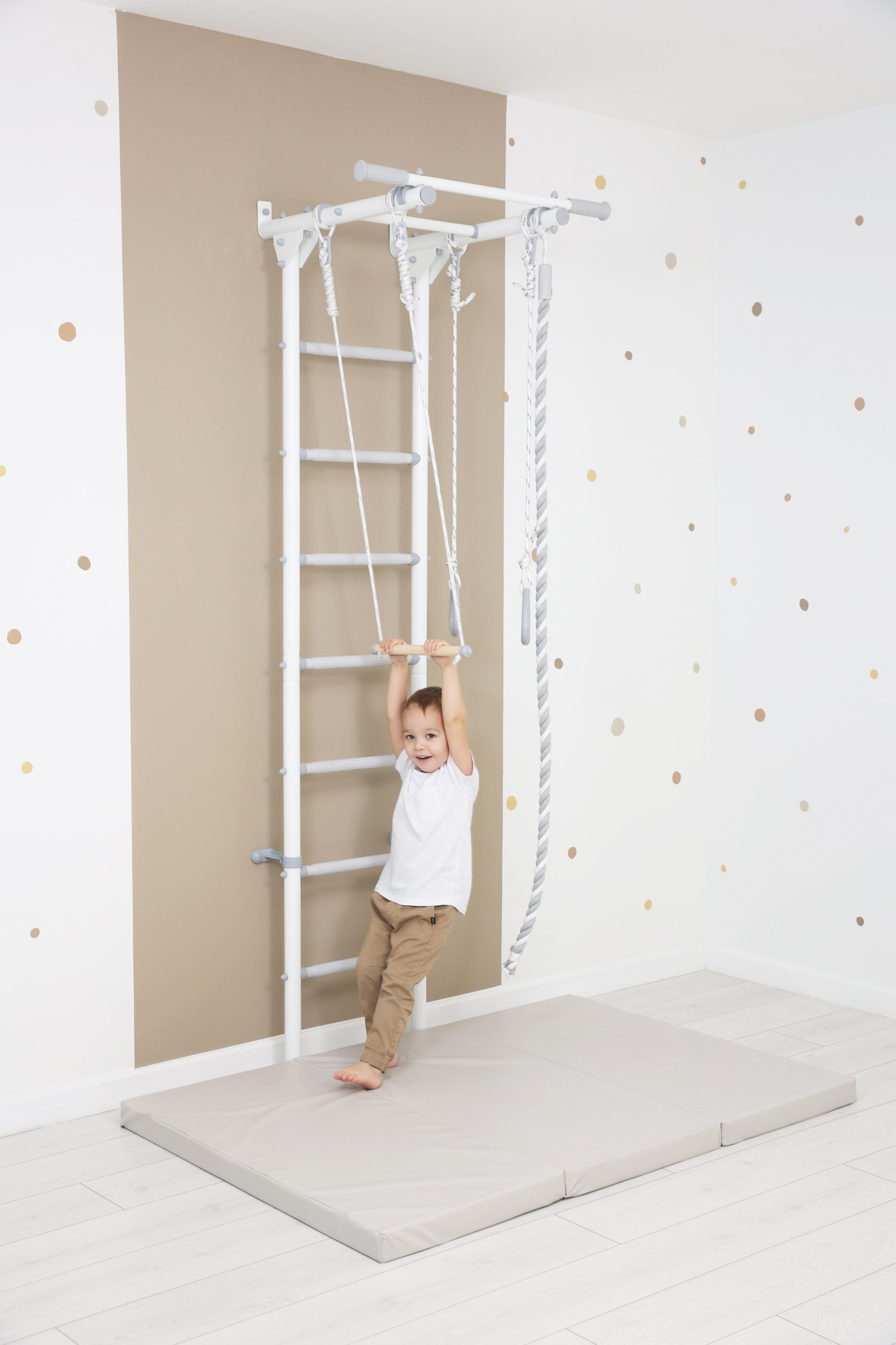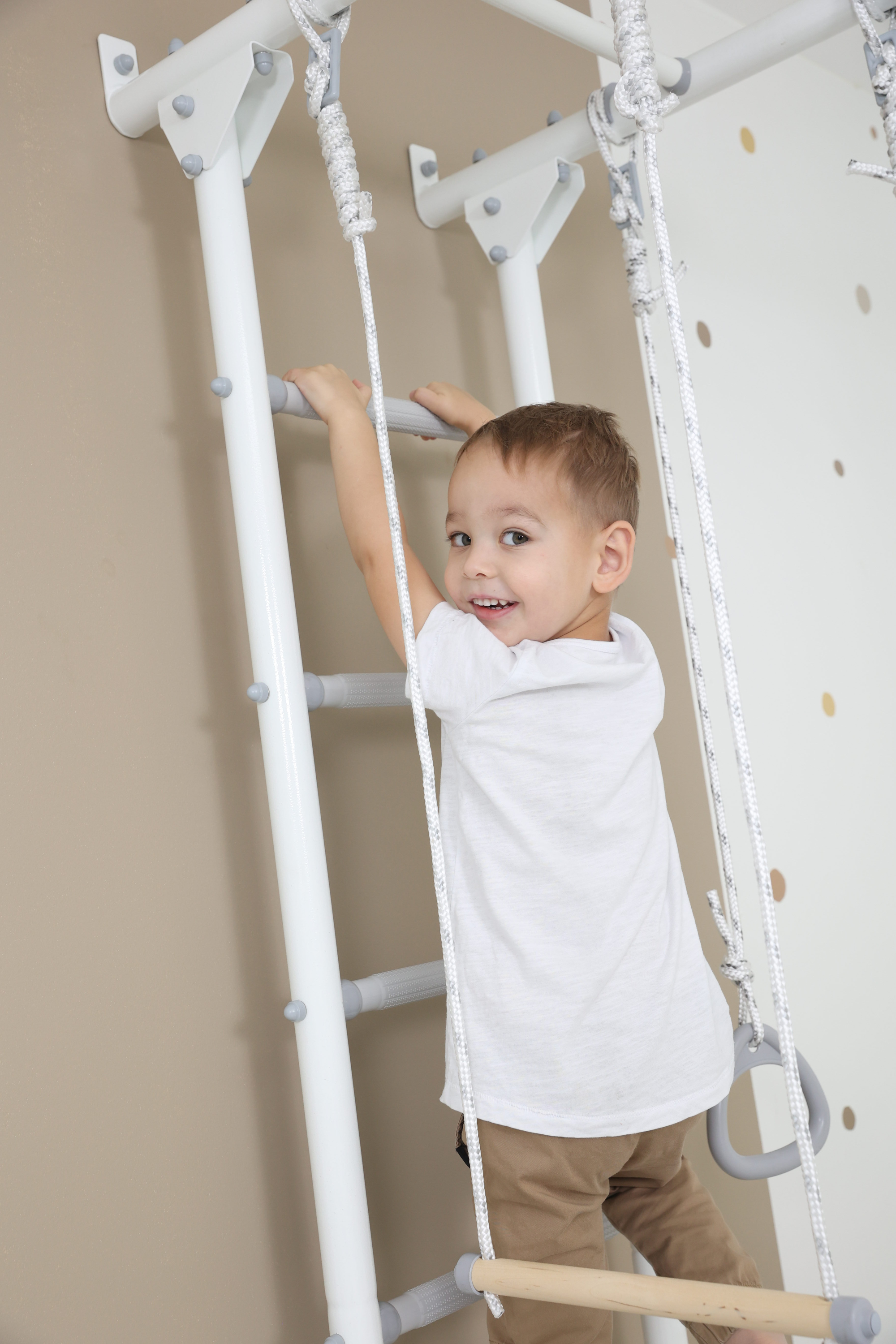В комплект спортивного комплекса входит дополнительное навесное оборудование - канат, гимнастические кольца и трапеция. Эти элементы разнообразят комплекс упражнений и являются отличными элементами активной игры для детей.