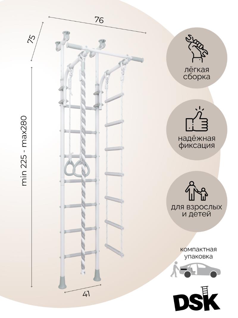 Шведская стенка DSK 7 — это универсальный спортивный комплекс, который заменит целый тренажерный зал в вашем доме. Она позволяет заниматься спортом всей семьей, не выходя из квартиры, и подходит как детям, так и взрослым. Регулируемый турник, входящий в комплект, адаптируется под любой возраст и уровень физической подготовки. Компактный дизайн и стильное сочетание пастельных цветов с серым корпусом прекрасно впишутся в любой интерьер.