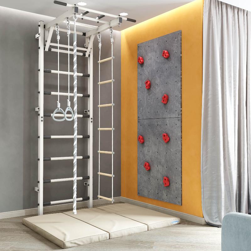 Наш комплекс изготовлен из экологически чистых и гипоаллергенных материалов, легко моющихся влажной безворсовой тканью. Каждый элемент обработан премиальной краской с матовой текстурой, которая не только придает изделию роскошный вид, но и обеспечивает приятное тактильное ощущение. С его элегантным дизайном, этот домашний комплекс легко впишется в любой интерьер. Монтаж и сборка производятся быстро и легко. Для дополнительной безопасности во время тренировок рекомендуется использовать мягкий защитный мат.
