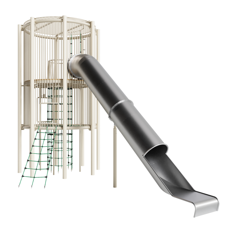 Каркас - сталь конструкционная, покрытие - цинкосодержащий грунт, окраска полимерным порошком (RAL по согласованию). Панели, ограждения - монолитный поликарбонат. Горки, скаты - сталь нержавеющая толщиной не менее 2 мм. Канатные сети, лазы, ограждения - канат армированный 16 мм. Настил - массив лиственницы, покрытие - антисептик и масл в 2 слоя.