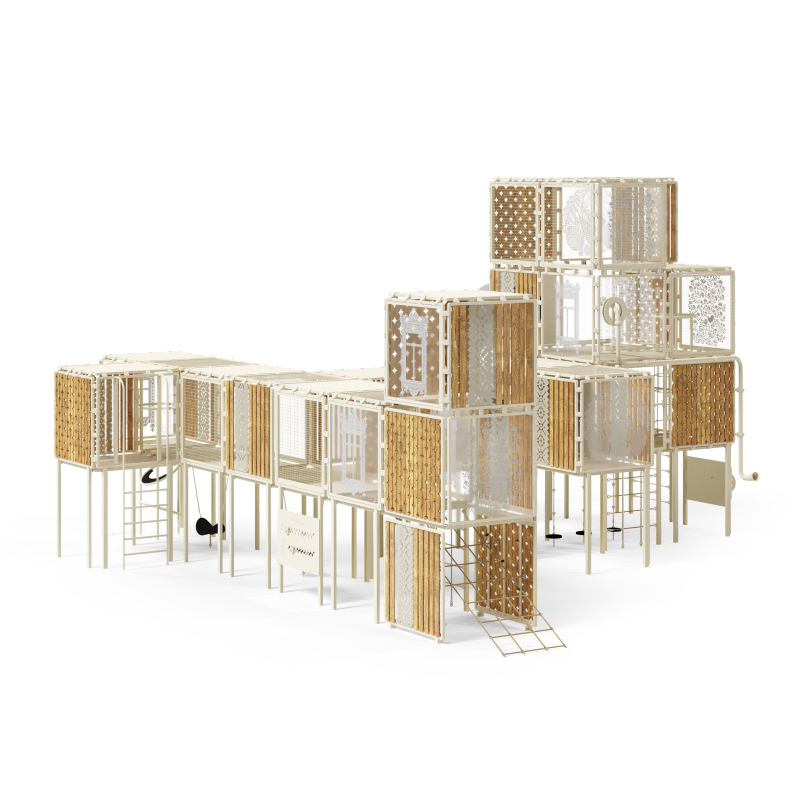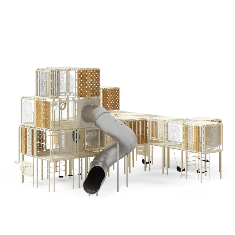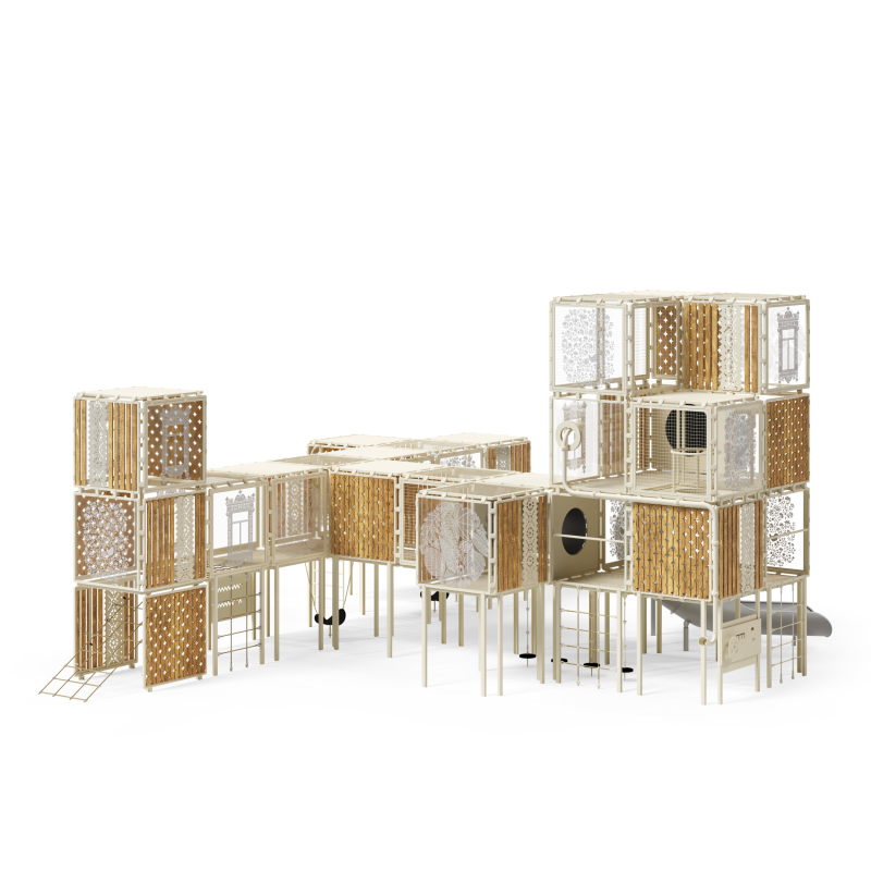 Каркас - металлопрокат сталь Ст3, покрытие - цинкосодержащий грунт, порошковая окраска (RAL по согласованию). Обшивка - дерево, покрытие - антисептик, масло террасное атмосферостойкое для древесины. Скаты - нержавеющая сталь. Панели HPL. Канатные сети, лазы, ограждения - канат армированный 16 мм. Декоративные части - монолитный поликарбонат не менее 3 мм.