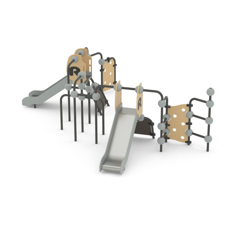 Конструкция обладает высокой ударопрочностью и виброустойчивостью. Во избежание травм и застревания одежды и частей тела, изделие разработано и изготовлено в соответствии с требованиями ГОСТ Р 52169-2012.Выполнен в виде металлических стоек из 057 трубы, соединенный шарами, имеются 2 горки h=950 мм., лазы.