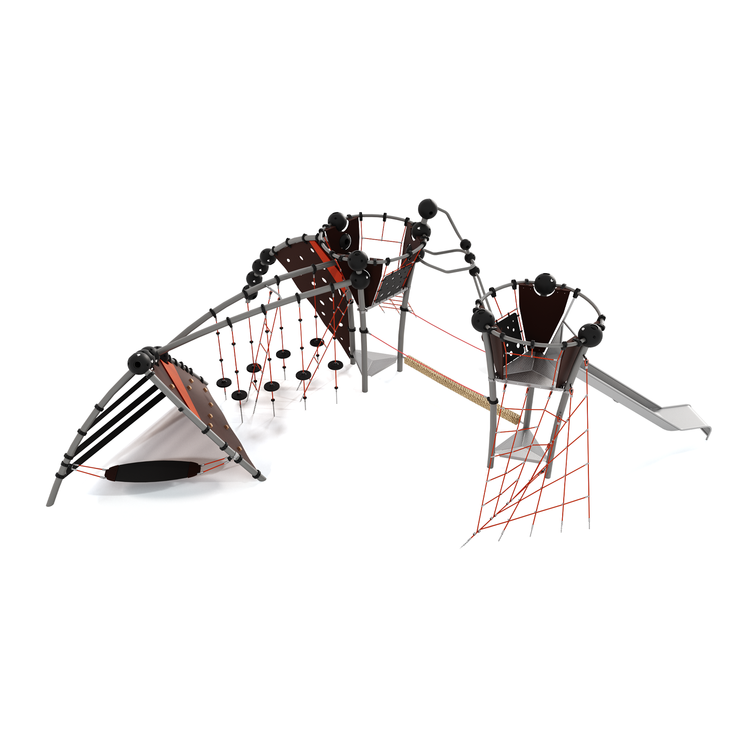 Каркас - сталь конструкционная, покрытие - цинкосодержащий грунт, окраска полимерным порошком. Горка - сталь нержавеющая толщиной не менее 2 мм, электрохимическая пассивация сварных швов. Панели - полипропилен/HPL. Канатные сети, лазы, ограждения - канат армированный 16 мм. Зацепы для скалолазания - пескобетонный композит. Конвейерная лента. Канат "Викинг".