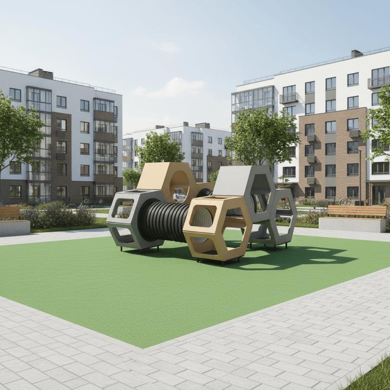 Игровой модуль для тематических игр и физического развития предназначен для детей в возрасте от 4 до 8 лет. Изделие должно представлять собой устойчивую конструкцию, обеспечивающую безопасные условия для занятий на открытом воздухе. Конструкция должна обладать высокой ударопрочностью и виброустойчивостью.В сборе представляет собой конструкцию в виде двух секций из трех шестигранных игровых элементов в сборе, четыре нижних из которых попарно соединены между собой лазом-трубой гофрированной. Четыре нижних элемента установлены на грунтозацепы.