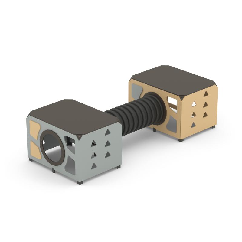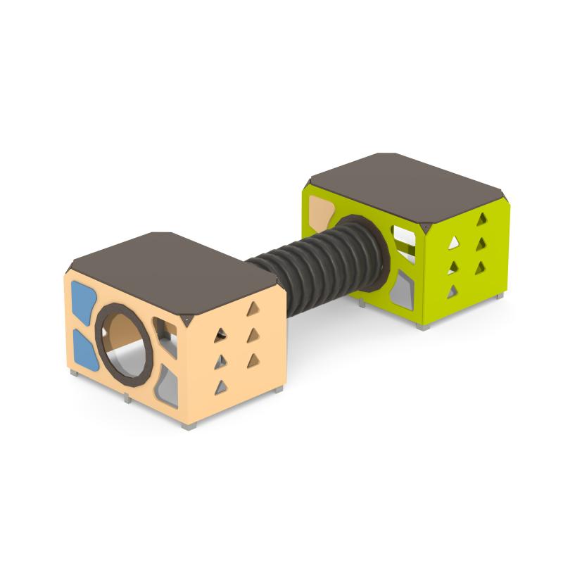 Игровой модуль для тематических игр и физического развития предназначен для детей в возрасте от 4 до 12 лет. Изделие должно представлять собой устойчивую конструкцию, обеспечивающую безопасные условия для занятий на открытом воздухе. Конструкция должна обладать высокой ударопрочностью и виброустойчивостью.В сборе представляет собой конструкцию в виде двух прямоугольных площадок, собраных со стенками с помощью уголков, установлены на грунтозацепы. Две площадки присоединены друг к другу с помощью лаза-труба.