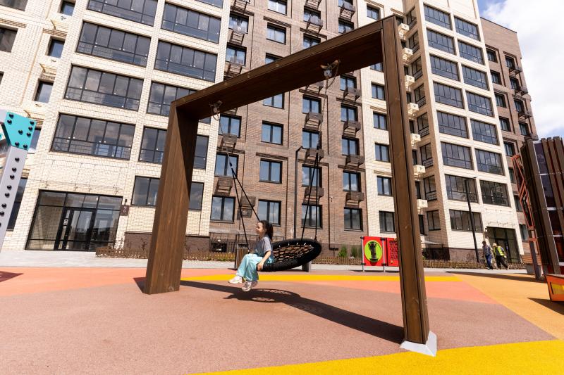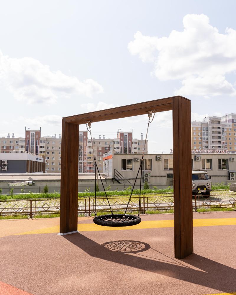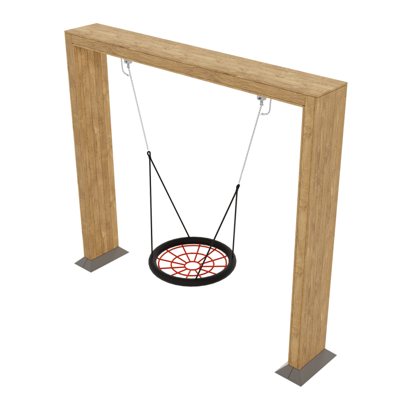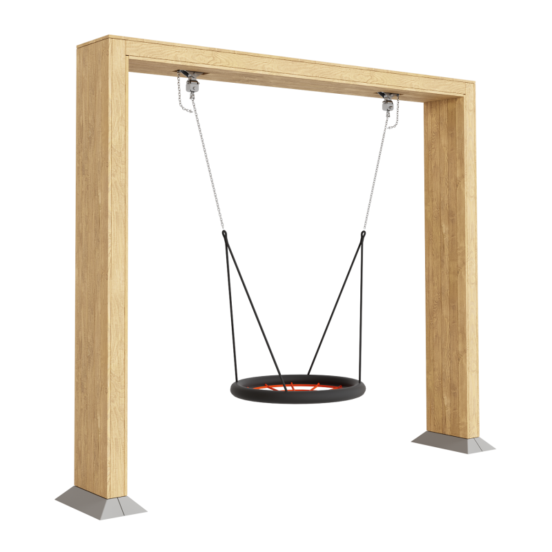 Каркас - сталь конструкционная, покрытие - цинкосодержащий грунт, окраска полимерным порошком (RAL по согласованию). Обшивка – дерево (массив), обработанное маслом террасным атмосферостойким для древесины в 2 слоя. Качели «Гнездо» - утяжеленный обод, плетение внутри кольца - четырехпрядный мягкий канат диаметром 16 мм.
