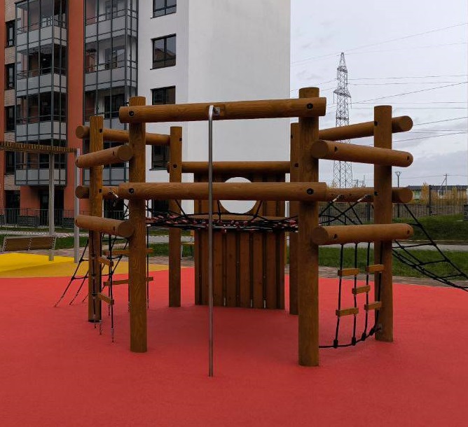 Каркас, обшивка - дерево, обработанное антисептиком и маслом террасным атмосферостойким для древесины в 2 слоя. Металлопрокат - сталь нержавеющая AISI 304, 430. Канатные сети - канат армированный 16 мм. Конвейерная лента. Зацепы - пескобетонный композит.